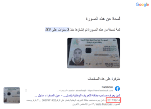 لقطة شاشة تظهر أن الصورة المرفقة بالادعاء متداولة منذ عام 2017 في سياق إعلان فقدان بطاقة تعريف شخصية
