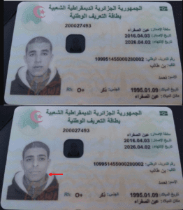 مقارنة الصورة المرفقة في الادعاء (في الأسفل) مع صورة أرفقت بإعلان فقدان بطاقة تعريف وطنية في الجزائر عام 2017