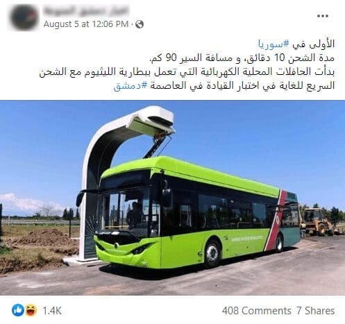 يتداول رواد موقع التواصل الاجتماعي فيسبوك صورة يزعم ناشروها أنّها تظهر حافلة كهربائية بدأت العمل مؤخرا في سوريا،