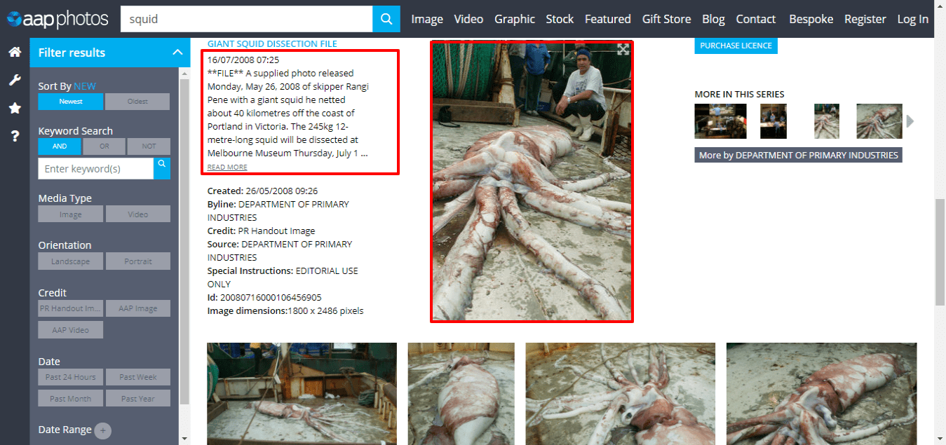 وبالبحث في موقع الصور الخاص بوكالة اسوشيتد برس الاسترالية AAP، عثرنا على صورة الادعاء ذاتها تحت عنوان حبار عملاق،