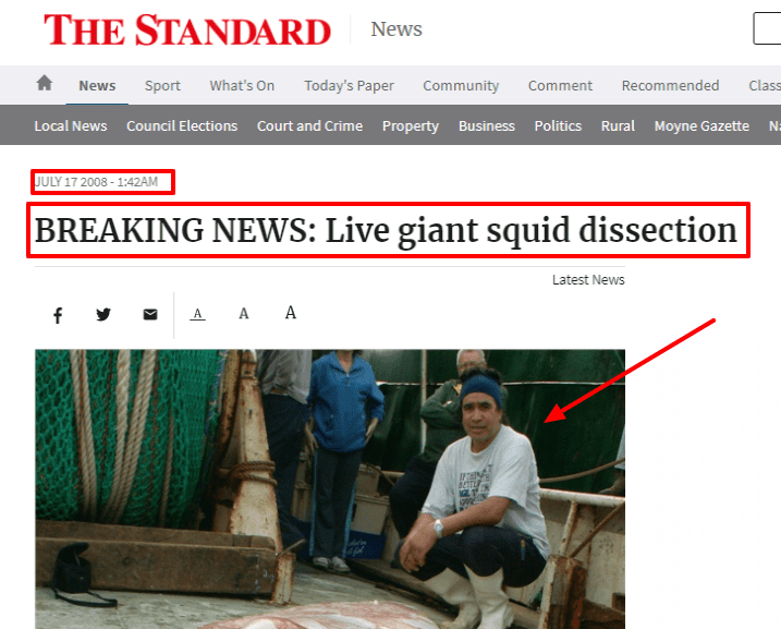 وبالبحث في محرك غوغل عن الكلمات الدلالية التالية: (giant squid portland)، عثرنا على خبر آخر على موقع The standard news نشر بتاريخ 26 مايو 2008،