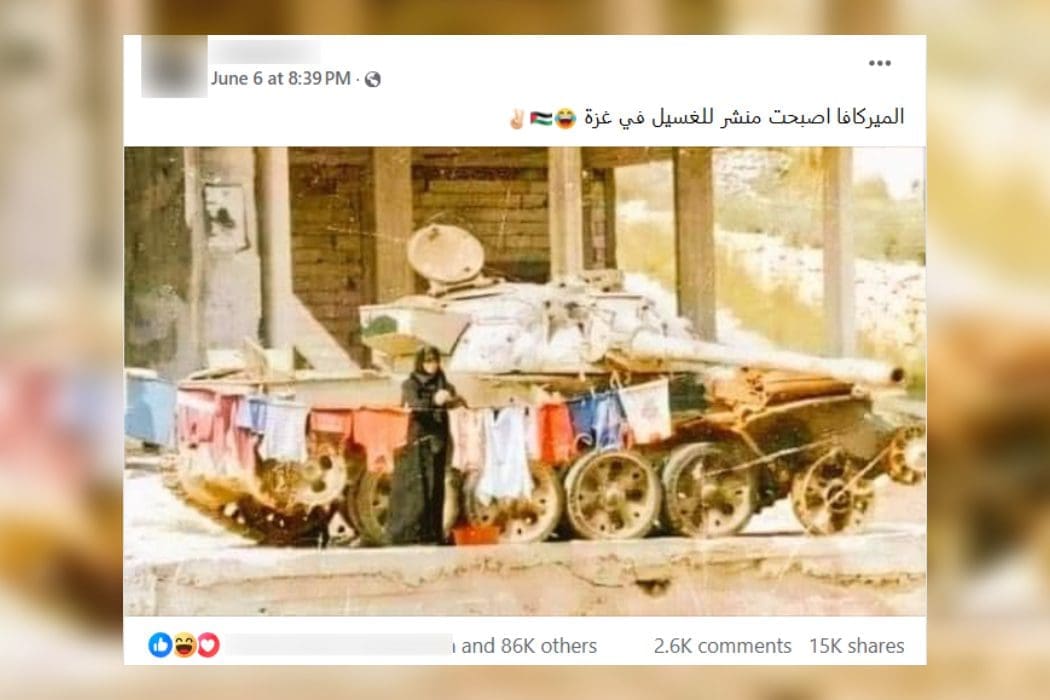 هذه الصورة لسيدة تنشر الملابس على دبابة مدمرة في بلدة ياطر اللبنانية عام 2002 وليس من غزة
