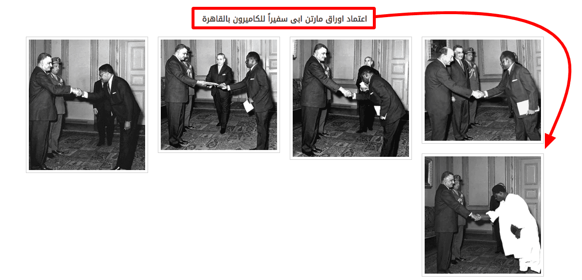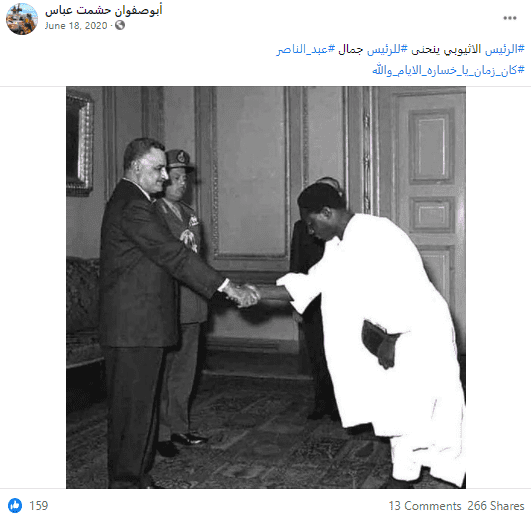 انتشرت على مواقع التواصل الاجتماعي فيسبوك وتويتر صورة يزعم ناشروها أنها تظهر الرئيس الإثيوبي وهو ينحني للرئيس المصري جمال عبد الناصر،