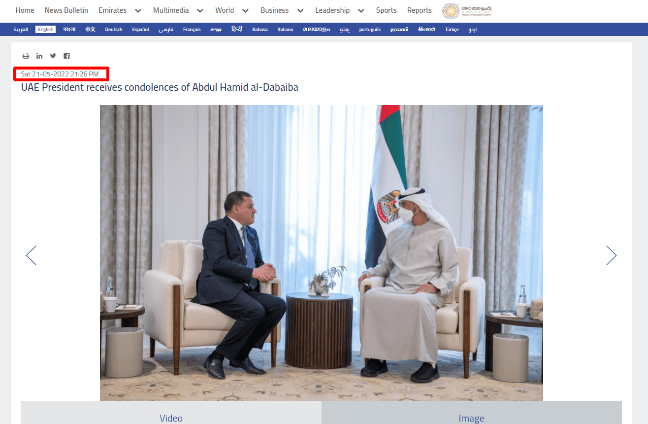 حيث نشرت الوكالة خبرا حول زيارة الدبيبة إلى أبوظبي يوم السبت 21 مايو التقى فيه رئيس دولة الإمارات محمد آل نهيان،