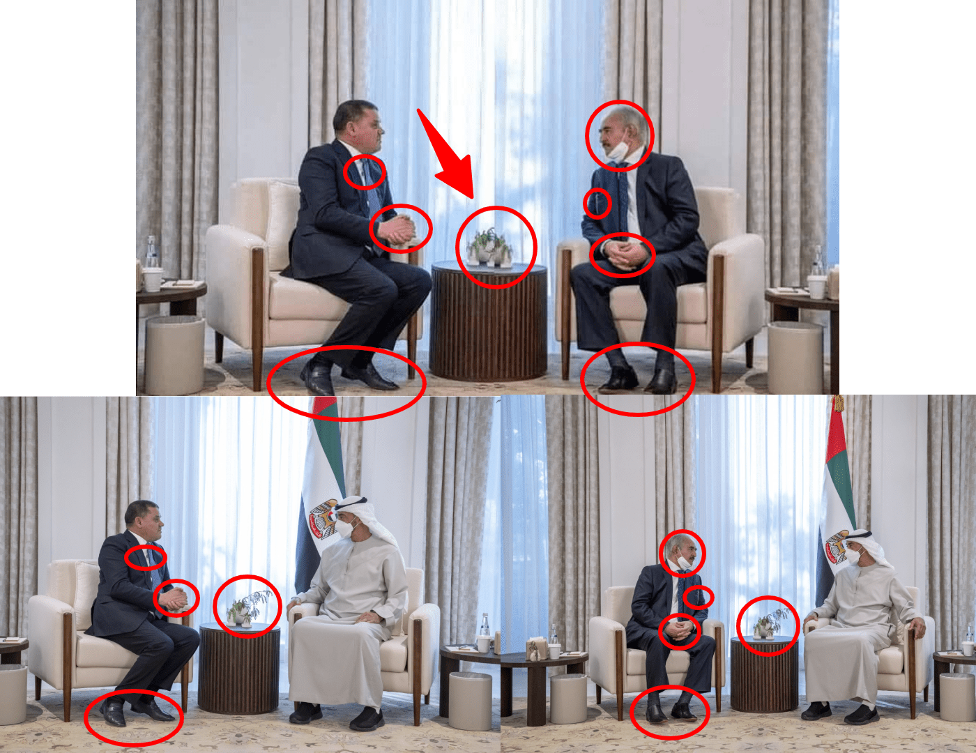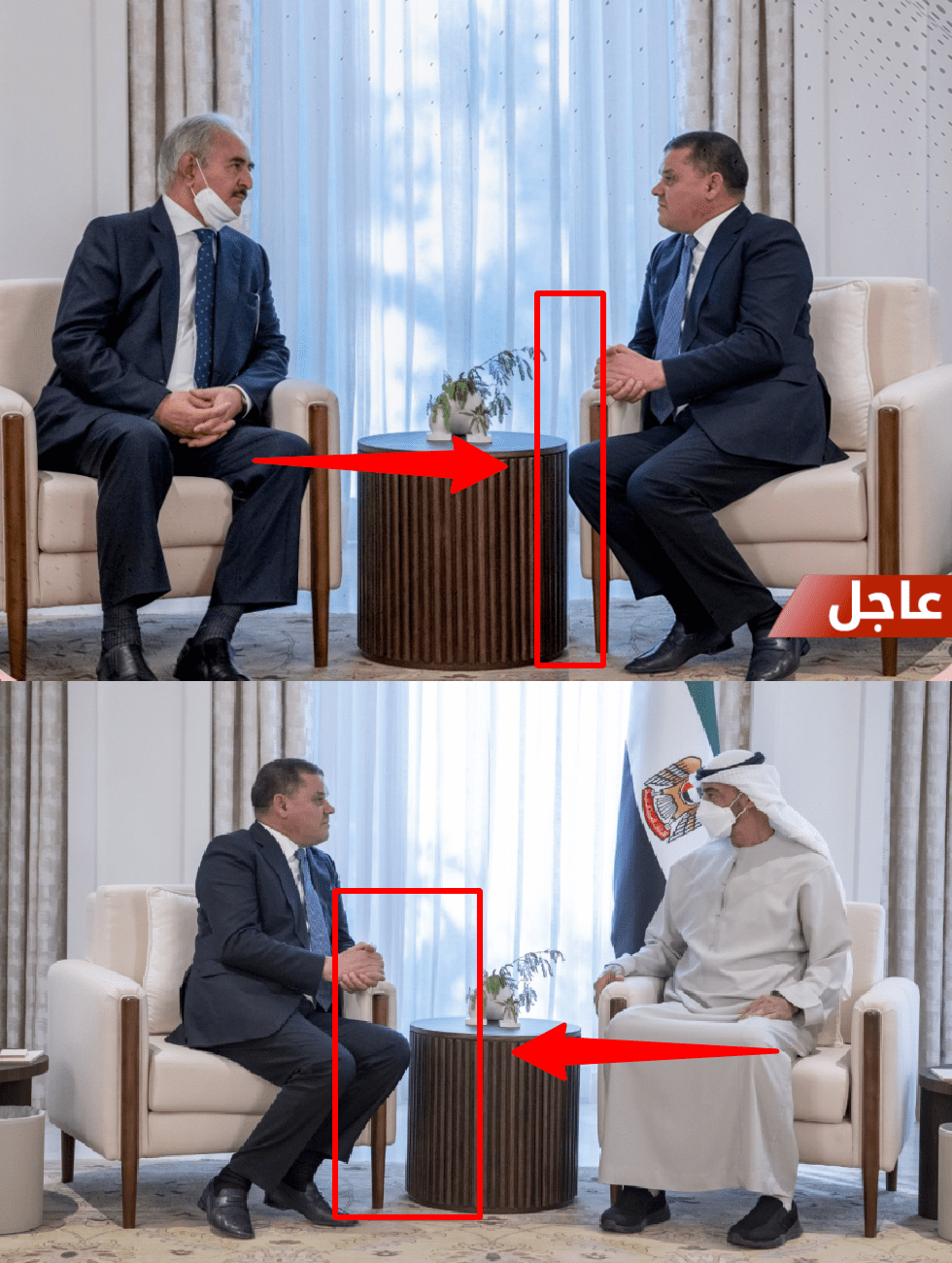 إذ تظهر الصورة الأولى خليفة حفتر على يسار الصورة وعبد الحميد الدبيبة على يمين الصورة، فيما تظهر الصورة الثانية عكس ذلك،