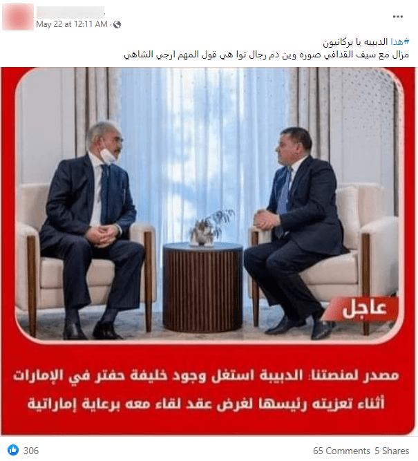 انتشرت على مواقع التواصل الاجتماعي صورة يزعم ناشروها أنها تظهر لقاء بين عبد الحميد الدبيبة وخليفة حفتر في الإمارات،