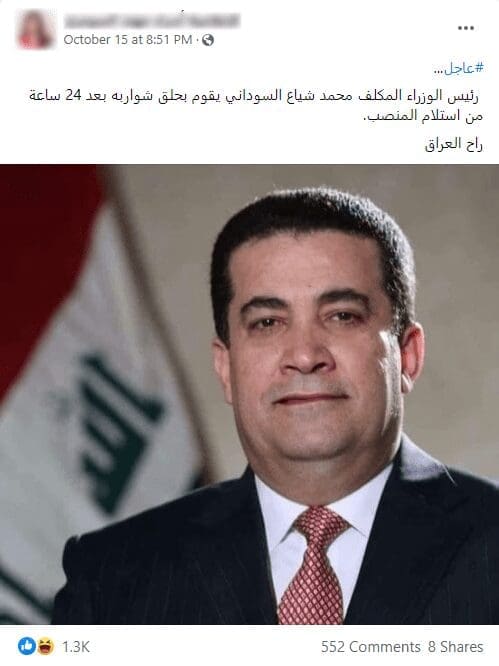 يتداول رواد موقع التواصل الاجتماعي فيسبوك صورة يزعم ناشروها أنّها تظهر محمد شياع السوداني وقد حلق شاربه بعد 24 ساعة من استلام منصب رئيس الوزراء العراقي.
