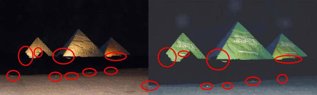 هذه الصورة مفبركة ولم يتم إِضاءة الأهرامات بالعلم السعودي مؤخرًا