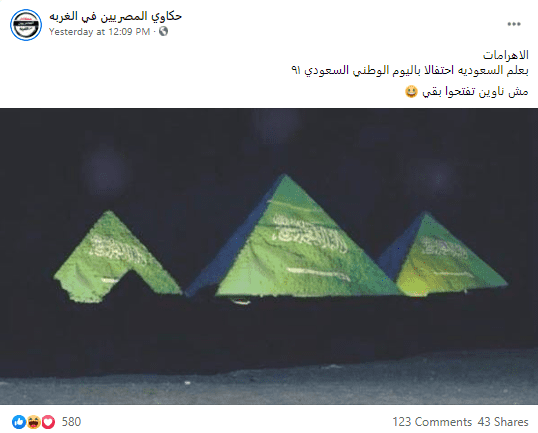 انتشرت على مواقع التواصل الاجتماعي صورة يزعم ناشروها أنها تظهر الأهرامات المصرية مضاءة بالعلم السعودي احتفالا باليوم الوطني السعودي ٩١،