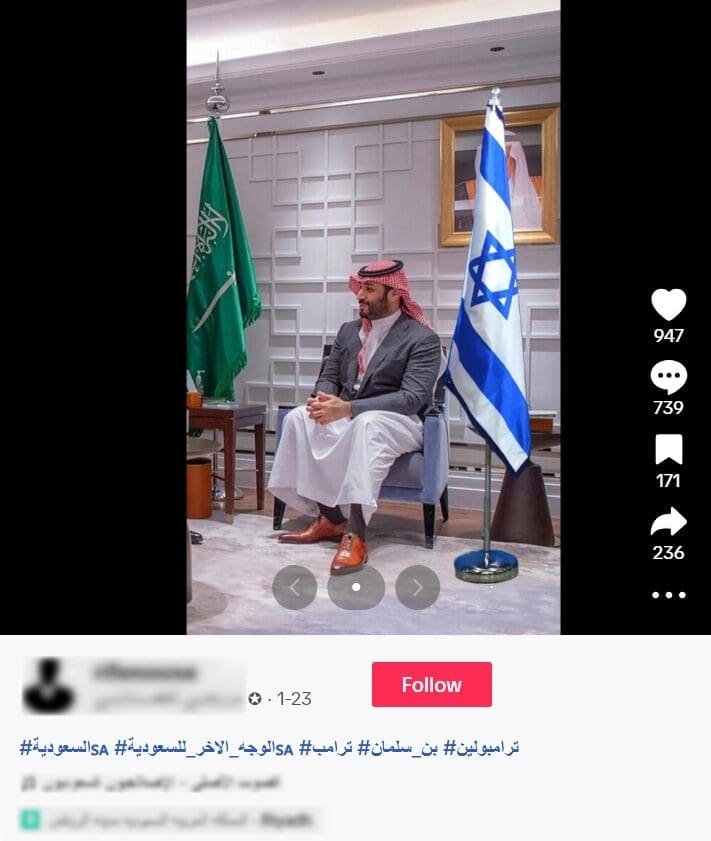 بحسب فرانس 24 –دون تصرف-: «أعرب ولي العهد السعودي الأمير محمد بن سلمان الأربعاء عن رفض المملكة تطبيع علاقاتها مع إسرائيل دون قيام دولة فلسطينية، منددا في الوقت نفسه بـ”جرائم سلطة الاحتلال الإسرائيلية بحق الشعب الفلسطيني”. وكانت بوادر التقارب بين البلدين لاحت في الأفق قبل نحو عام عندما صرح ولي العهد بأن التطبيع بين الرياض وتل أبيب “يقترب كل يوم أكثر فأكثر”. كما أكد رئيس الوزراء الإسرائيلي بنيامين نتانياهو حينها من على منبر الأمم المتحدة أن بلاده على “عتبة” إقامة علاقات مع السعودية.» في هذا السياق تداول ناشطون على التيكتوك صورة يدعون أنها تظهر محمد بن سلمان وإلى جانبه علم إسرائيل.