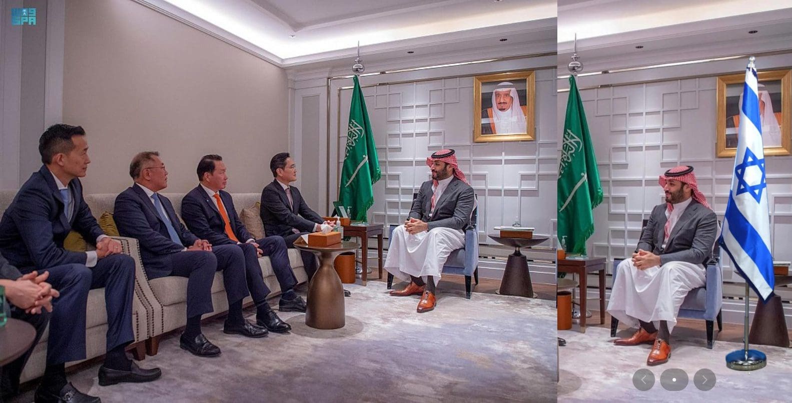 هذه الصورة مفبركة، والأصلية تعود للقاء الأمير محمد بن سلمان رؤساء شركات كورية في سيئول عام 2022، ولا تصوره وبجانبه العلم الإسرائيلي
