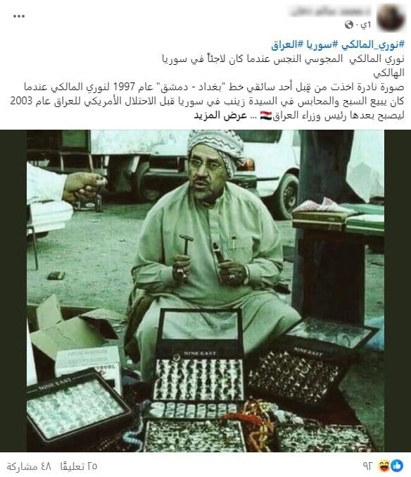 هذه الصورة مفبركة، ولا تظهر رئيس الوزراء العراقي الأسبق نوري المالكي بائعًا للسبح والمحابس في سوريا