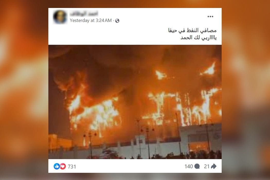 في أعقاب ذلك تداول ناشطون على فيسبوك صورة يدعون أنها تظهر احتراق مصافي نفط في حيفا إثر هذا الاستهداف،