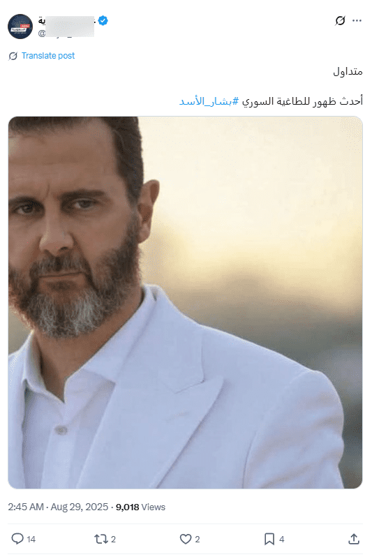 لم يعثر فريق “فتبينوا” على أي صور حديثة أو أخبار أو مقاطع فيديو من مصادر موثوقة توثق ظهورًا حديثًا لبشار الأسد في روسيا. إذ إن الأسد كان قد غادر إلى روسيا في ديسمبر 2024 بعد سقوط نظامه، وحصل على اللجوء هناك مع عائلته.