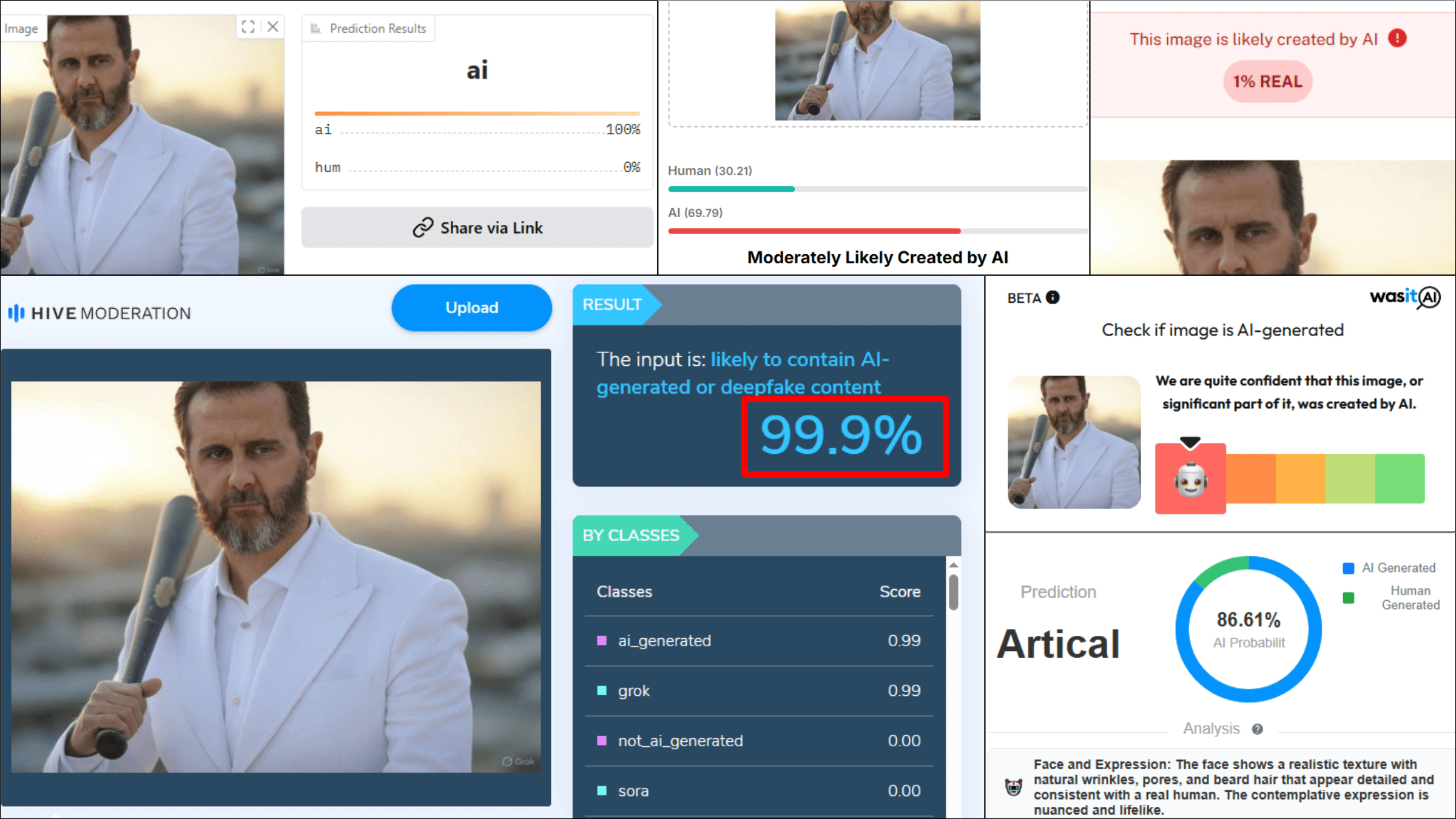 قدّمت هذه الأدوات تقييمات مختلفة لكن نتائج متطابقة، حيث أشارت جميعها إلى أن الصورة مولدة بالذكاء الاصطناعي، وبلغ أعلى تقييم %99.9 من أداة Hive، مما يؤكد أن الصورة غير حقيقية ومولدة بالذكاء الاصطناعي.