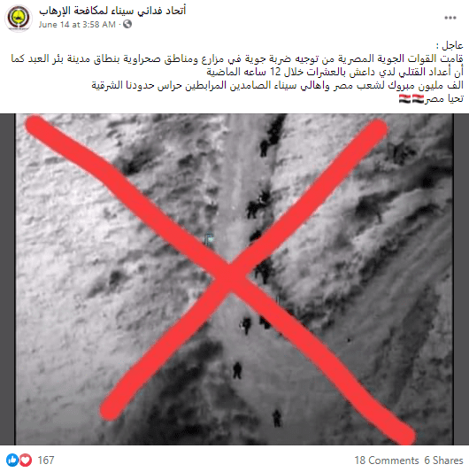 نشرت صفحة أتحاد فدائي سيناء لمكافحة الإرهاب على موقع التواصل الاجتماعي فيسبوك صورة وأرفقتها بالنص الوصفي الآتي (من دون تصرّف):