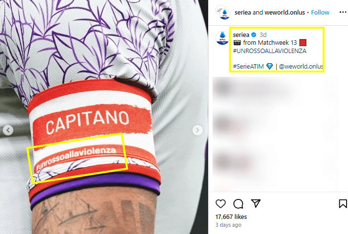 صورة من حساب رابطة الدوري الإيطالي لارتداء أحد قادة الأندية لشارة القيادة ويظهر فيها شعار حملة القضاء على العنف ضد المرأة